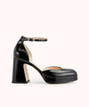 In black cracked patent leather
